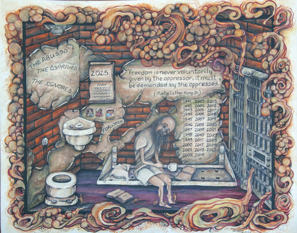 Kerr says he shares the following poem and painting with one goal in mind: to expose and bring awareness to the injustices that remain unchecked in prisons within and beyond Texas. He can be emailed on Securus by adding him as a contact using his name “Russell Dudley Kerr“ and number “00557098,” and leaving a return stamp. His mailing address is “Russell D. Kerr, #00557098, Coffield Unit, 2661, FM 2054, Tenn.Colony, TX. 75884.” — Kilhah St. Fort