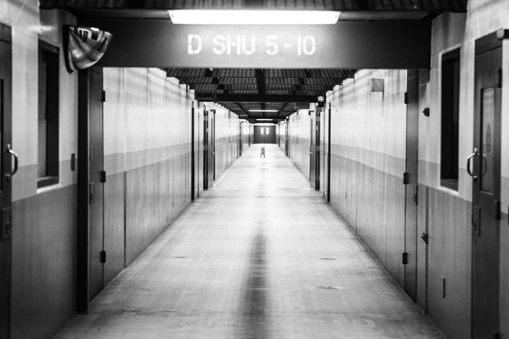 Ariel view of Pelican Bay State PrisonEntrance to the SHU (Credits: Nancy Mullane)Pelican Bay prison tower and perimeter fence. (Credits: Capital Public Radio / Katie Orr)SHU hallway leading to cell pod (Credits: Nancy Mulllane)Corridor inside the SHUA SHU corridor at Pelican Bay (Credits: Del Norte Triplicate / Bryant Anderson)A prisoner watches TV wile writing a letterA SHU cell with double bunksToilet and sink in a SHU cell (Credits: Capital Public Radio / Katie Orr)SHU units at Pelican Bay (Credits: kalw.org)A prisoner inside his solitary confinement cell (Credits: Nancy Mullane)View of a cell from approximately oe step inside cell door area (Credits: California Prison Watch)A SHU Cell in PBSP (Creditss: Capital Public Radio / Katie Orr)View of another cell at Pelican Bay (Credits: California Prison Watch)Inside view of a cellView f sink and toilet and desk area with TV (Credits California Prison Watch)Floor area of a cell at PBSPSHU bunk at PBSP (Credits: KPCC / Rina Palta)SHU concrete exercise yard (Credits: Laura Sullivan)A prisoner in the recreations area, where he is permitted highly controlled exercise (Credits: Los Angeles Times)A visitation window at PBSP (Credits Del Norte Triplicate / Bryant Anderson)Prisoners shackled together (Credits: California Department of Corrections and Rehabilitation)A prisoner is shackled prior to his cell door bring opened (Credits: The New York Times / Jim Wilson)A gurney covered in rior gear ar=t entrance to the Short Corridor (Credits: Del Norte Triplicate / Bryant AndersonA “gunner” in his post (Credits (Del Norte Triplicate / Bryan Anderson)Prison guard carries a rifle any tmea guard enters 10 cell pod (Credits Santa Rosa Press Democrat / John Burgess)A PBSP correctional officer makes rounds at a Security Housing UnitA “gunner” monitors a SHU pod (Del Norte Triplicate / Bryant Anerson)